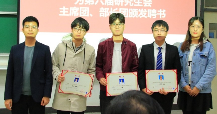 在宣读《太阳成tyc7111cc集团第二届研究生会主席团、部长团人员调整报告》后,第二届研究生会主席团、部长团正式卸任,由汪昭、程杨为主席团、部长团颁发聘书。