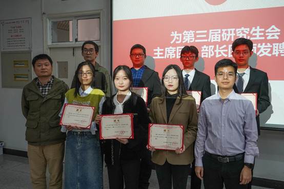 在宣读《太阳成tyc7111cc集团第三届研究生会主席团、部长团人员调整报告》后,第三届研究生会主席团、部长团正式卸任,由梁浩伟、汪昭为主席团、部长团颁发聘书。