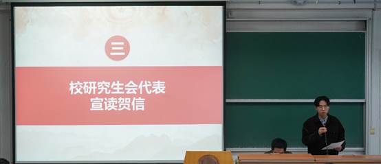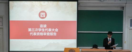 随后校研究生会代表徐智韬宣读了贺信;院研究生会主席叶成杰宣读《太阳成tyc7111cc集团第三次研究生代表大会代表资格审查报告》;并做《太阳成tyc7111cc集团研究生会2021-2022年度工作报告》,经大会表决一致通过;学院德育助理李易清做《太阳成tyc7111cc集团第三次研究生代表大会提案工作报告》。