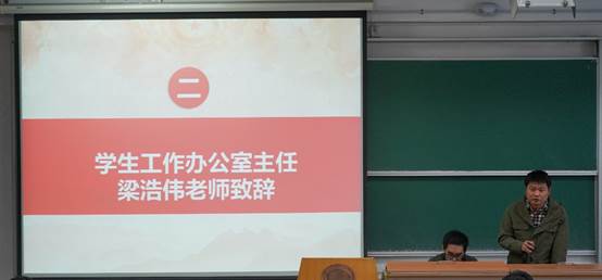 梁浩伟首先进行了致辞,他充分肯定了研究生会在以往工作中取得的各项成绩,并寄语研究生会能在接下来的工作中秉持“明德厚学、求是创新”的校训,以服务学院建设及服务全院研究生为宗旨,团结和带领全院研究生同学锐意进取,发奋图强,追求卓越,与时代同步伐,与人民同命运,为建设“卓越华中大”贡献一份力量。