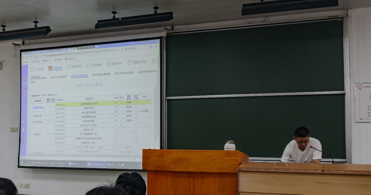 2023级博士生郝国凯进行了硕博选课系统操作演示,展示了查询课程、选择课程、确认选课等步骤,并分享了选课经验和注意事项。黄雪峰老师就选课问题进行了现场答疑。研究生辅导员汪昭对校内业务办理流程及近期工作安排进行了介绍。