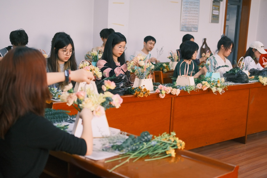 随后,在田嫚的演示引导下,同学们开始设计自己的插花作品。插花前要对花枝、花叶进行修剪,并选定花材进行色彩搭配。同学们在容器中放入绿植作为打底,并根据自己的创意,插入花材,塑造整体造型。在创作过程中,同学们积极交流,互相分享,深刻感受到插花的乐趣。