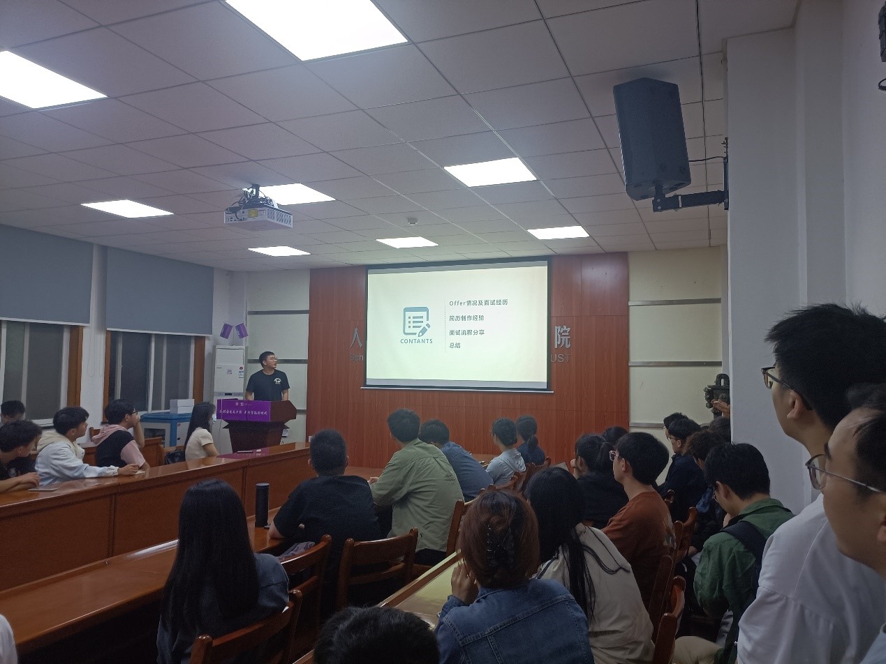 随后签约科大讯飞的于富盛从“简历制作”、“面试中注意事项”两方面分享自身经验。他强调在制作简历时要着重突出与工作相关的专业技能,项目经历部分要简明扼要,重点写自身贡献和项目成果。面试过程中,面试官对简历中所涉及内容的提问要保证能熟练答出。同时他还指出求职应尽早考虑,研二同学可从当下就开始准备秋招。