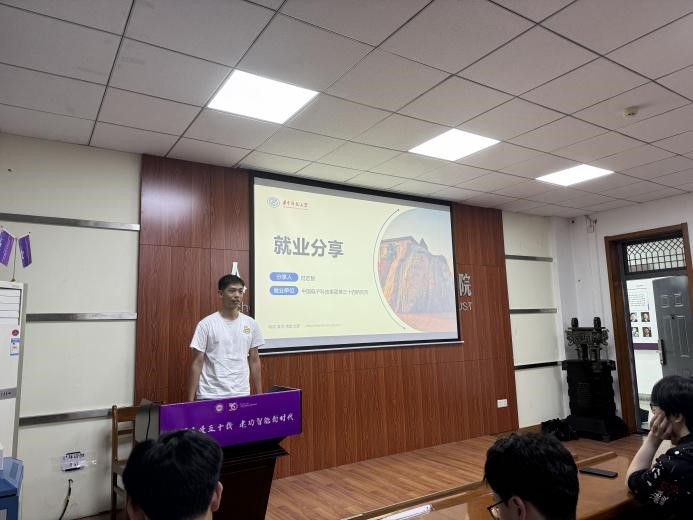 随后签约湖北航天技术研究院总体设计所的王智敏从“简历制作与投递”、“研究所招聘流程”两方面分享自身经验。他分享了自己投递研究所的招聘流程和面试方式,强调要关注各个研究所的投递开始时间和招聘渠道,建议同学们提前准备面试中可能遇到的问题,同时也建议同学们在选择就业岗位时需要考虑清楚自己的需求,多多尝试,不要把赌注压在一条赛道上。