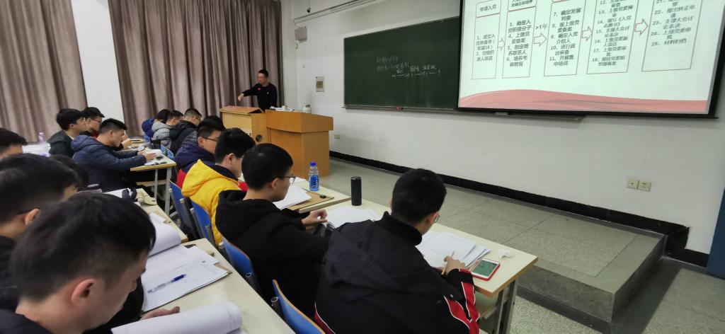 王泽楠首先向发展对象详细介绍了党员发展地流程,他从提交第一份入党申请书,到成为积极分子,再到成为发展对象,经过支部大会讨论接收其为预备党员,到最后的培养考察转正,全面细致地讲解了党员发展的过程中的重要环节,让与会人员对我院党员发展流程有了更清晰的认识。