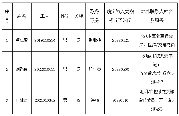 根据学院党委安排,经学院智能科学与技术系教师党支部和自动控制系教师党支部推荐、支部民主评议、征求党内外意见、支部委员会讨论,报学院党委审批,现拟定智能科学与技术系刘禹良,自动控制系卢仁智、叶林涛为发展对象,信息如下: