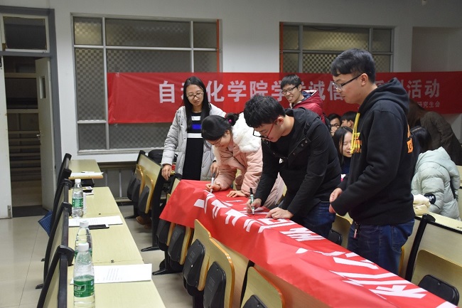 最后,现场同学积极参与到学术诚信签名活动中,在“不忘初心,诚信先行”的横幅上写下自己的名字,表达了自觉端正治学态度,投身治学行动,充实治学成果,争当学风优良,品德优秀的学术先锋的决心和信念。