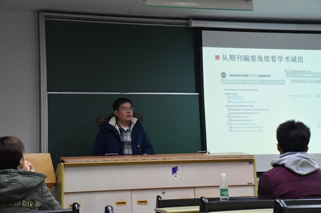 此次交流活动围绕学习贯彻落实党的十九大精神,陈都鑫、潘彤、陆昊依次上台开展交流。首先陈都鑫从投稿人和审稿人的两个角度分析了学术诚信的必要性;其次潘彤从案例入手,生动地向我们展示了在学术研究中违背学术诚信所带来的严重后果:不仅是对个人名誉的损害,也是对实验组其他人员的不尊重;最后陆昊以自己的科研经历为例子指出“在学术研究中,恪守学术诚信,不仅是对他人劳动成果的尊重,也是在为自己的诚信信用积分,长期的坚持,不仅会在学术领域中为自己树立一个良好积极的形象,也会引得别人的信任,是一个长期积累投资的结果”。