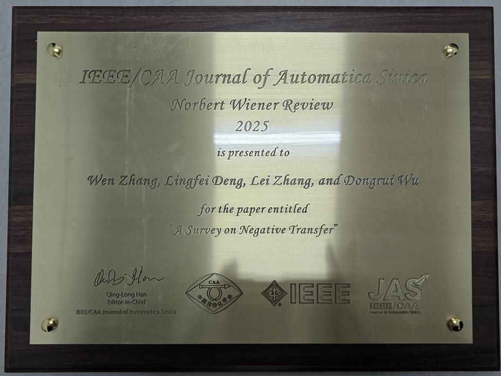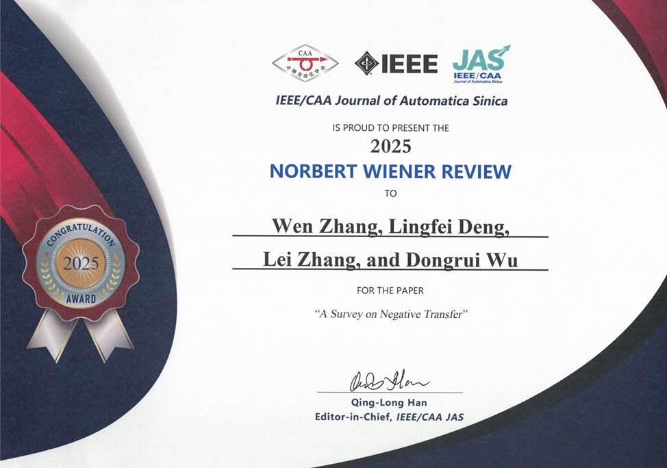 2025年10月11日,在哈尔滨召开的中国自动化大会上,我院伍冬睿教授团队2023年发表于IEEE/CAA Journal of Automatica Sinica(自动化学报英文版,影响因子19.2)的综述论文:W. Zhang, L. Deng, L. Zhang and D. Wu*, “A survey on Negative Transfer,” IEEE/CAA Journal of Automatica Sinica, 10(2):305-329, 2023.获该刊2025年度Norbert Wiener Review论文奖。这也是伍冬睿教授团队获得的第7个杰出论文奖。