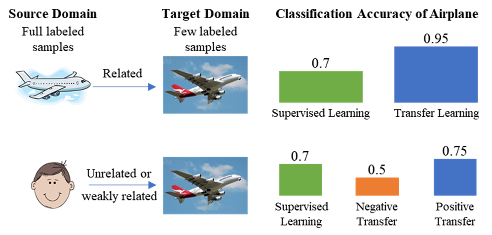 然而,迁移学习并非总是有效,除非其3个基本假设都得到满足:1)源域和目标域的学习任务相似或相关;2)源域和目标域数据分布比较接近;3)存在一个源域和目标域同时适用的模型。当这些假设不满足时,就会发生负迁移,即使用源域的数据或知识反而会让目标域学习性能变差,不如直接用目标域的数据进行训练,如下图所示: