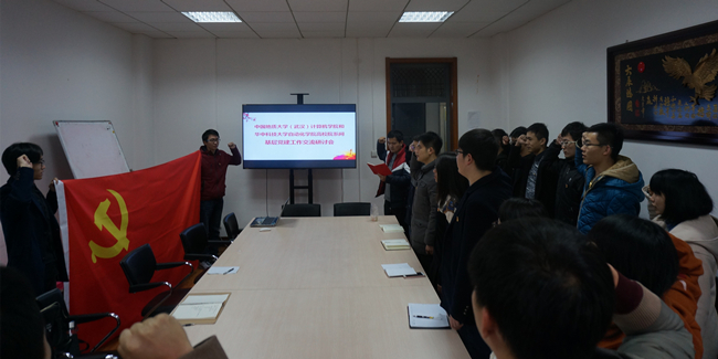 在重温入党誓词后,两院学生党建工作学生组织分别介绍了双方学生党建工作的整体情况。中国地质大学计算机学院学生党建办副主任张凯同学介绍了学生党建办公室机构设置、部门职能以及建设情况,展示了特色活动开展和工作成效。我院学生党建工作小组主任李致远同学介绍了党建工作小组策划部、秘书部、媒体部以及学习部的工作开展情况,展示了工作成效和优秀做法。