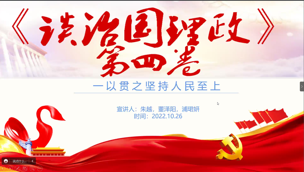 首先,硕士2109党支部朱越带领党员们集中学习了《习近平谈治国理政》第四卷。并通过展示相关资料,深刻领会到习近平总书记在历史交汇期的深邃思考和科学判断。随后,硕士2107党支部李毅轩带领学习了中国共产党第二十次全国代表大会的精神,分别从科教兴国、文化自信自强、增进民生福祉等方面进行了讲解。