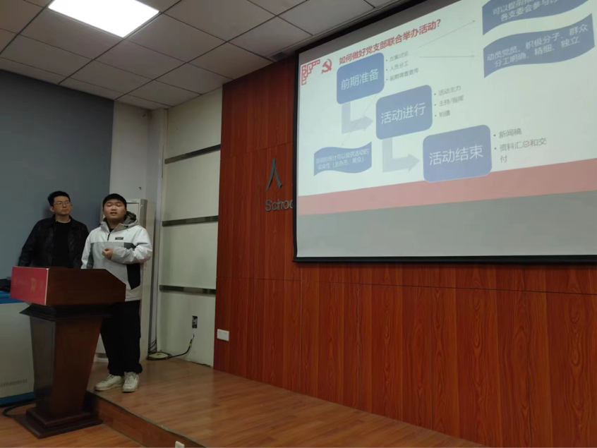 在“支部书记面对面”环节,学院邀请到硕士2209党支部和硕士2208党支部的支部书记分别进行了经验分享。硕士2209党支部书记杨浩分享了与其他党支部联合举办活动的经验,并分析了党支部联系组织活动的优势,给出了合办活动的建议。硕士2208党支部书记黄叶清分享了支部积极分子培养的方案,为其他学生党支部书记进一步做好发展党员工作提供了参考。