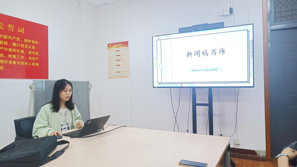 张钰婷为研究生骨干进行新闻写作的培训。她围绕写作原则与特点、常见写作体裁、新闻写作的构成与新闻写作的结构四部分进行讲授,总结新闻稿写作的五点技巧,帮助与会同学了解如何写好一篇合格的新闻稿,并在最后与大家进行了互动交流。