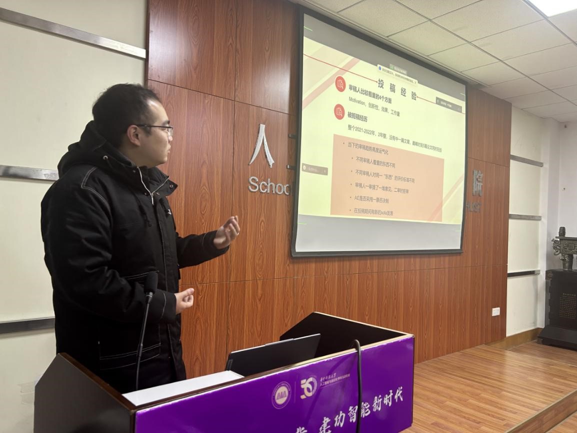 会议伊始,国家奖学金获得者袁子康进行经验分享。他充分考虑同学心中关切,聚焦科研,从投稿经验、科研观、团队意识三个角度分享了自己的经验及感悟。他讲述了自己的科研心态从水文章到坚持做有意义的研究的转变过程,并强调了要坚持做有意义的研究以及重视团队精神对于开展科研的重要性。在提问环节,他还表明了自己将致力于我国科研和教育事业的决心。
