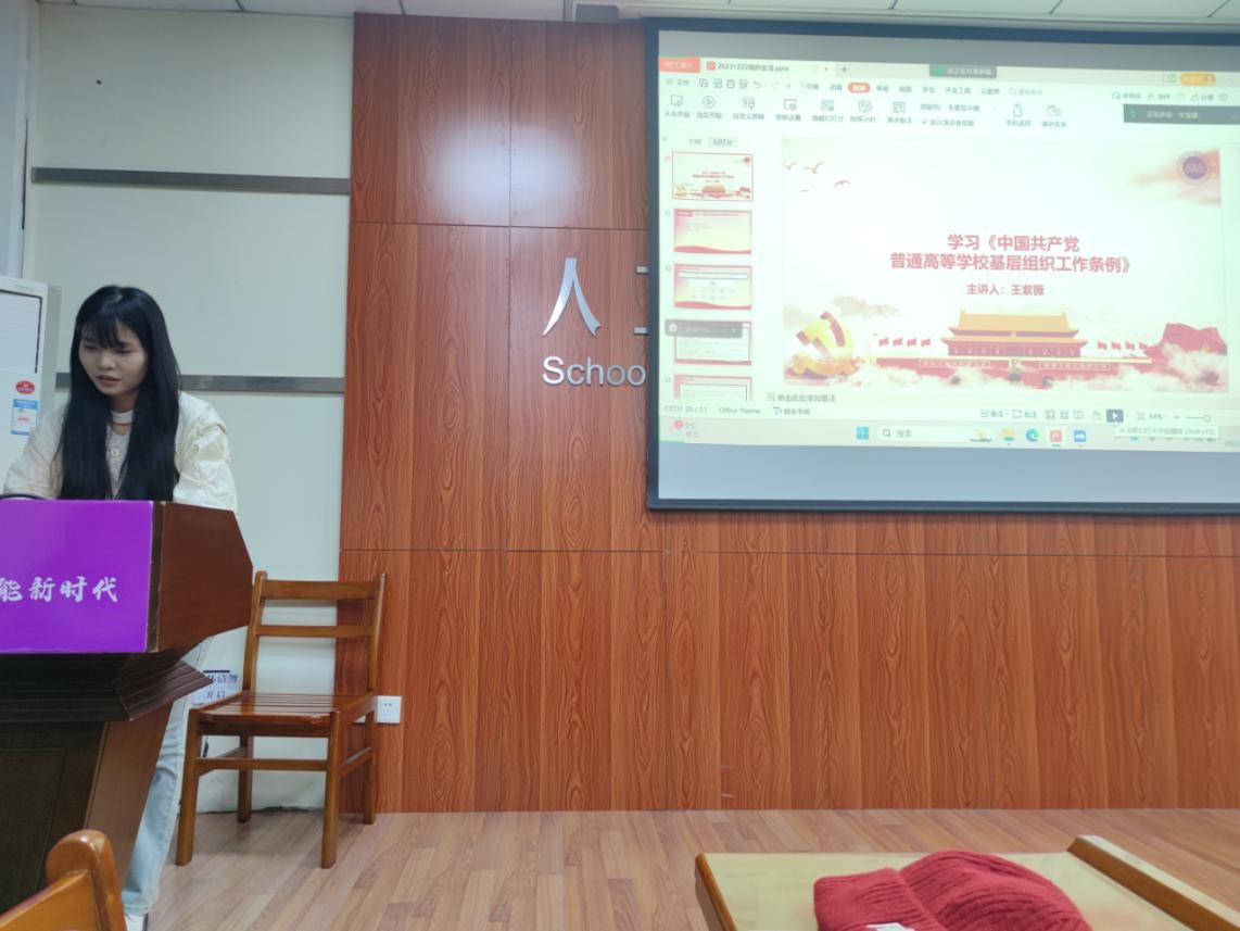 专题学习结束后,2023级博士生一班党支部支部书记王紫薇带领大家学习了《中国共产党普通高等学校基层组织工作条例》。她首先介绍了《条例》的框架结构和章节布局,并着重讲解了《条例》调整完善的内容,最后针对“如何贯彻落实《条例》”这一具体问题向大家分享了自己的想法和学习感受。